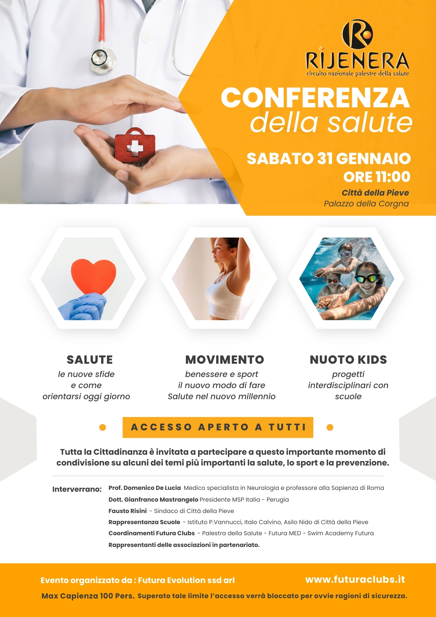 Durante la conferenza interverranno professionisti del settore medico, rappresentanti delle istituzioni, del mondo sportivo e scolastico, con l’obiettivo di offrire spunti concreti e una visione moderna del concetto di salute nel nuovo millennio ed esporre le progettualità ed iniziative attive sul territorio.